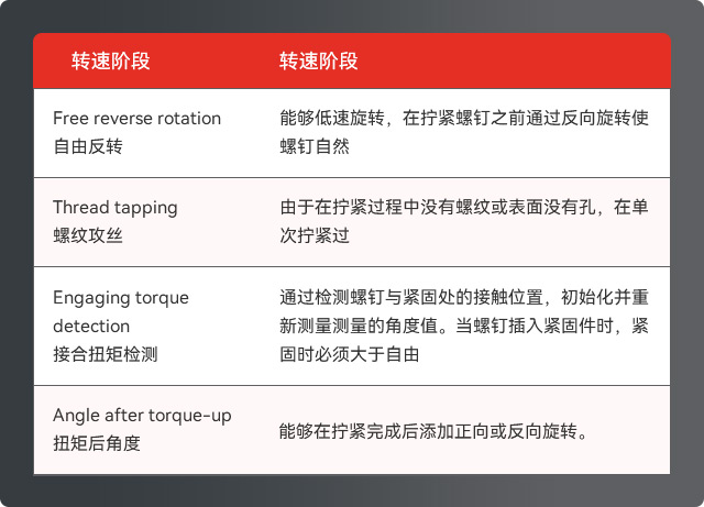 該功能用于檢測(cè)螺紋的初始嚙合狀態(tài)。 嚙合扭矩常用于一類特定場(chǎng)景:在擰緊操作開始前,需要讓驅(qū)動(dòng)器(如電動(dòng)螺絲刀、扳手等)先進(jìn)行空轉(zhuǎn)。 一旦系統(tǒng)檢測(cè)到螺紋已開始嚙合,便會(huì)啟動(dòng)標(biāo)準(zhǔn)擰緊參數(shù),完成后續(xù)的擰緊流程。