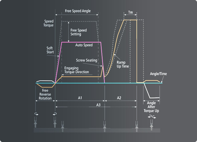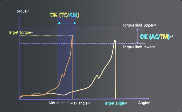 夾緊控制功能負(fù)責(zé)監(jiān)控并調(diào)節(jié)兩項(xiàng)關(guān)鍵參數(shù): A. 落座扭矩(Seating Torque) 與 B. 夾緊扭矩(Clamp Torque)。 該功能的核心作用是:一方面確保緊固件(如螺絲、螺栓等)能夠完全 “落座”(即緊固件頭部與工件表面貼合到位), 另一方面在落座后施加精準(zhǔn)的夾緊扭矩,完成緊固過程。